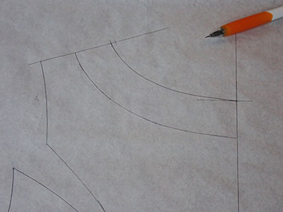 前後身頃パターンに見返しのラインを記入してパターンを作製。シーチングに写して見返しを裁断します。同型の接着芯も裁断します。