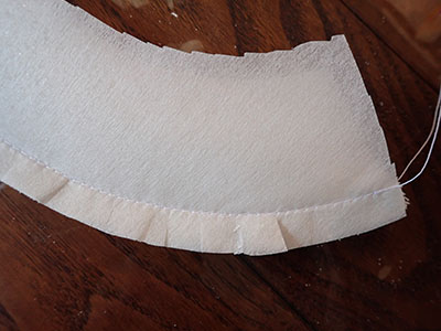見返し表側と芯地のりがついていない側を合わせて見返し端を中縫いします。カーブ部分は切り込みを入れておきます。接着芯、写真見えている側にのりがついています。