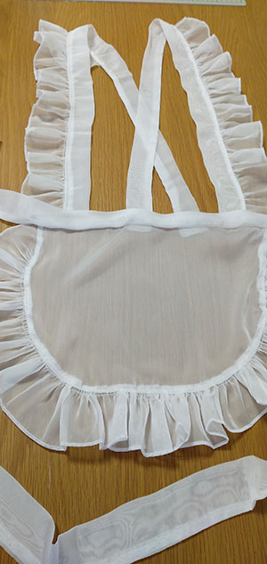 肩ヒモ部分にギャザーを寄せたフリルを付けます。後ウエストリボンを2重仕立てになるよう中縫いをします。各パーツが出来上がったので合体させていきます。前ウエストベルト部分端に後リボンを挟み込みます。前ウエストベルトとエプロンウエスト部分を中縫いをしてロックミシンを掛けます。後は肩ヒモをウエストベルトに止め付ければ完成です。ご自宅で付け位置、長さを確認して仕上げていただきます。