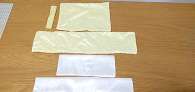 胸に飾りで付けるリボンを作製します。リボン大黄色サテン地にはレース地を添わせて周りを仮止めして2枚縫い合わせます。たれ部分も同様にレース地を添わせて2枚縫い合わせます。リボン小白サテン地も同様に2重仕立てにします。ここで時間になってしまったので組み立てはご自宅で作業していただきます。