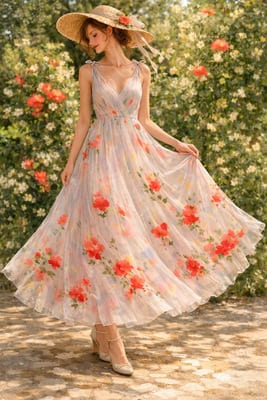 デザインはキャミソールタイプでVネックのハイウェスト切り替え。丈はくるぶしまでくるロング丈。ソフトチュールやオーガンジーの様な透け感のある素材を重ねて作る予定で、脇にコンシールファスナー。メインの柄はイメージ通りのプリントではなかなか見つけることが難しいかもしれないと話しつつ、素材のイメージも膨らませました。